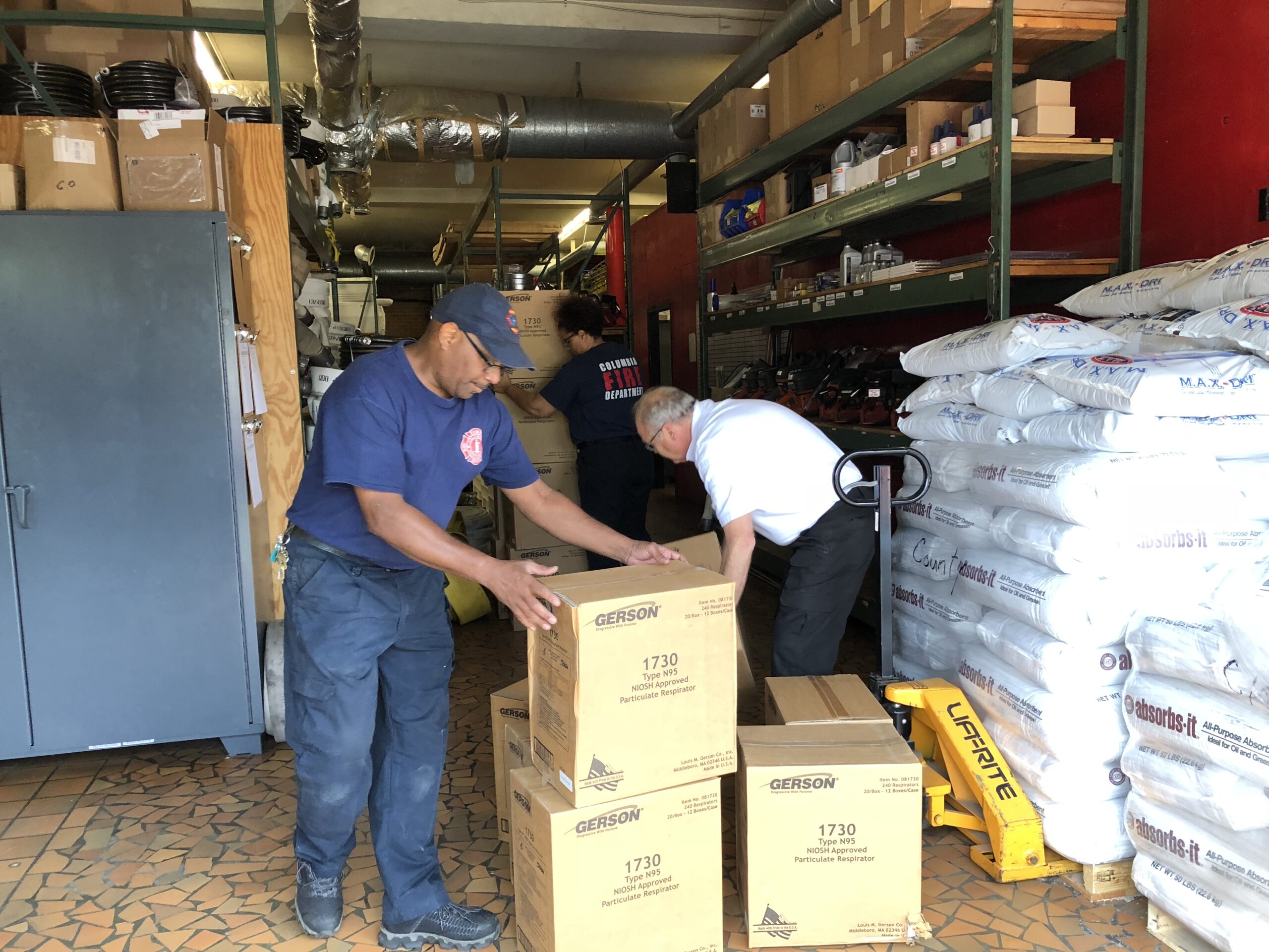 Logistics department at CFD offloads 29 cases of respirator masks from Schneider Electric.
