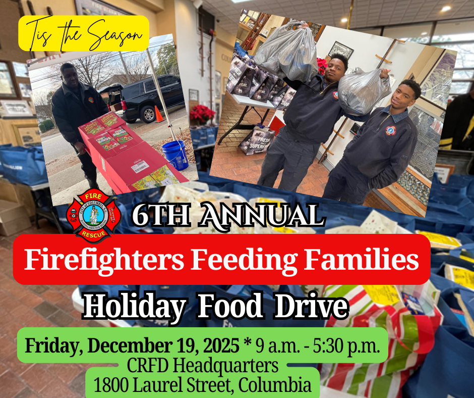 The department has begun taking donations for its sixth annual ‘Firefighters Feeding Families Holiday Food Drive.’ From now through Friday December 19, 2025 area citizens can drop off canned goods and non-perishable food items at our many stations across the City of Columbia and Richland County. December 19 will be our final community collection day before food taken in will be distributed.