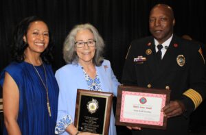 (Vi Hendley (center) with Columbia City Manager Teresa Wilson & Fire Chief Aubrey D. Jenkins)