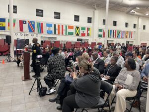 (left: Fire Chief Jenkins addresses attendees at the Richland One School Board Meeting February 25, 2025 – right: Dreher High School Students Eliza Jones, Micah Roth and Hampton Rogers stand with Donna McIntosh Aiken)
